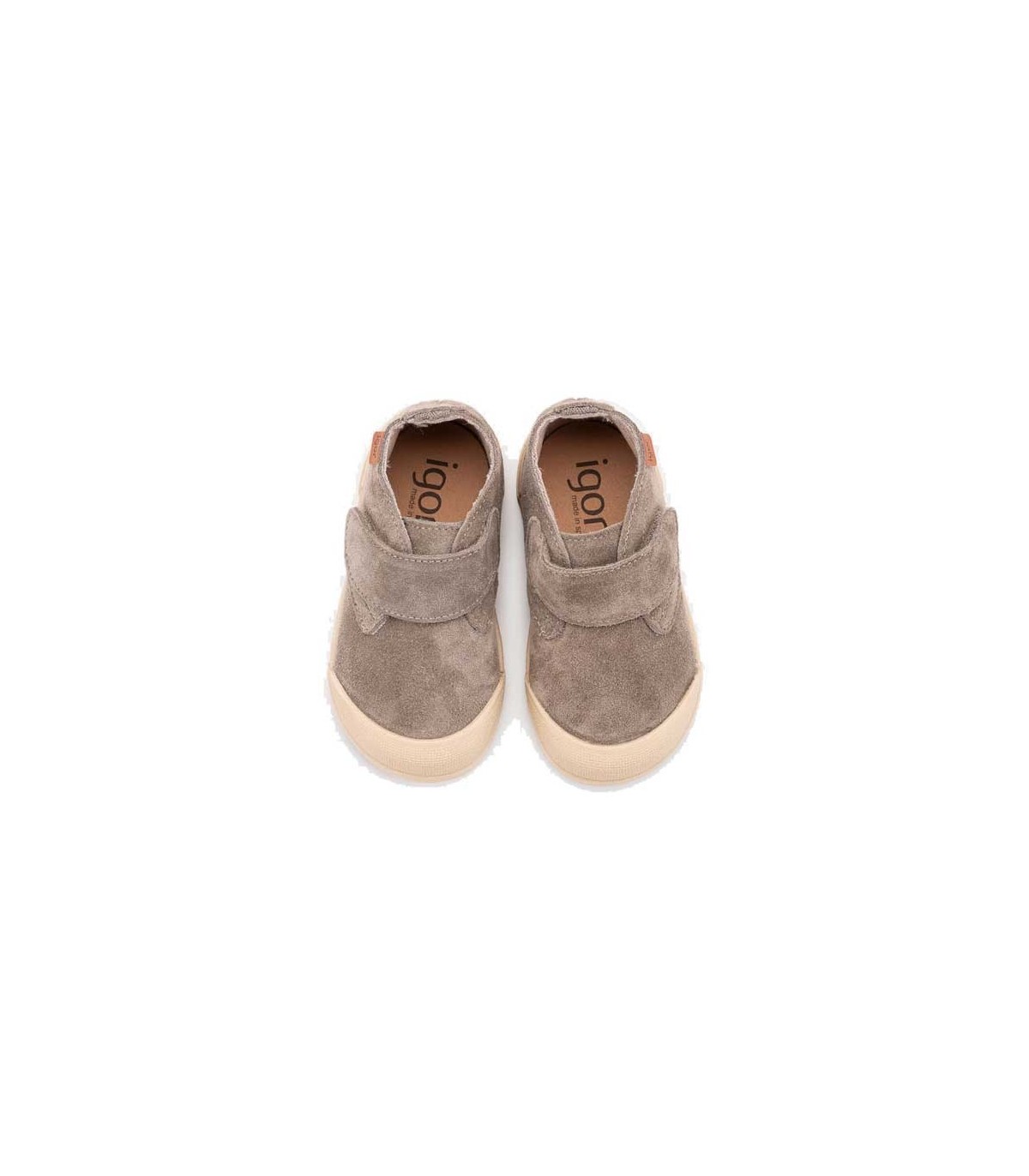 Botín de serraje concepto barefoot, flexible y blandito con drop cero. Plantilla extraíble acolchada y cierre con tira adhesiva para un buen ajuste. Color Topo.