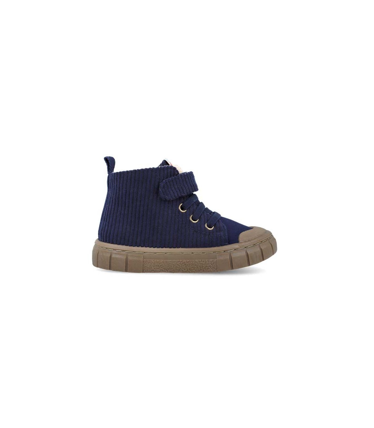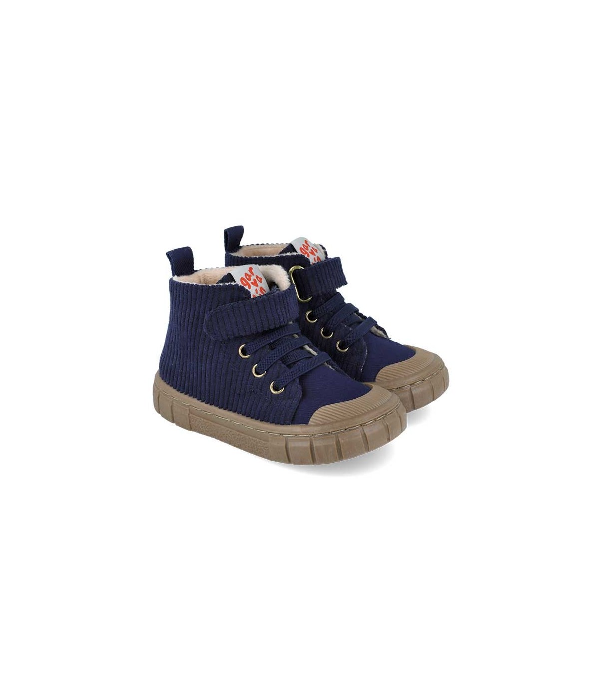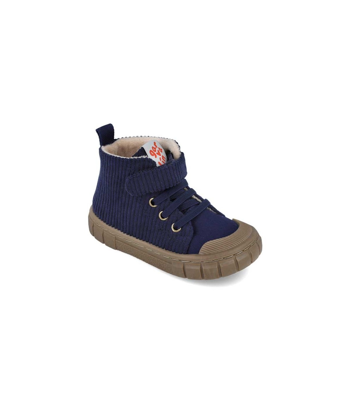 Botín de pana de Garvalín en color Azul, cierre con un velcro y elástico, suela de goma color caramelo y puntera reforzada. Interior de borreguillo.