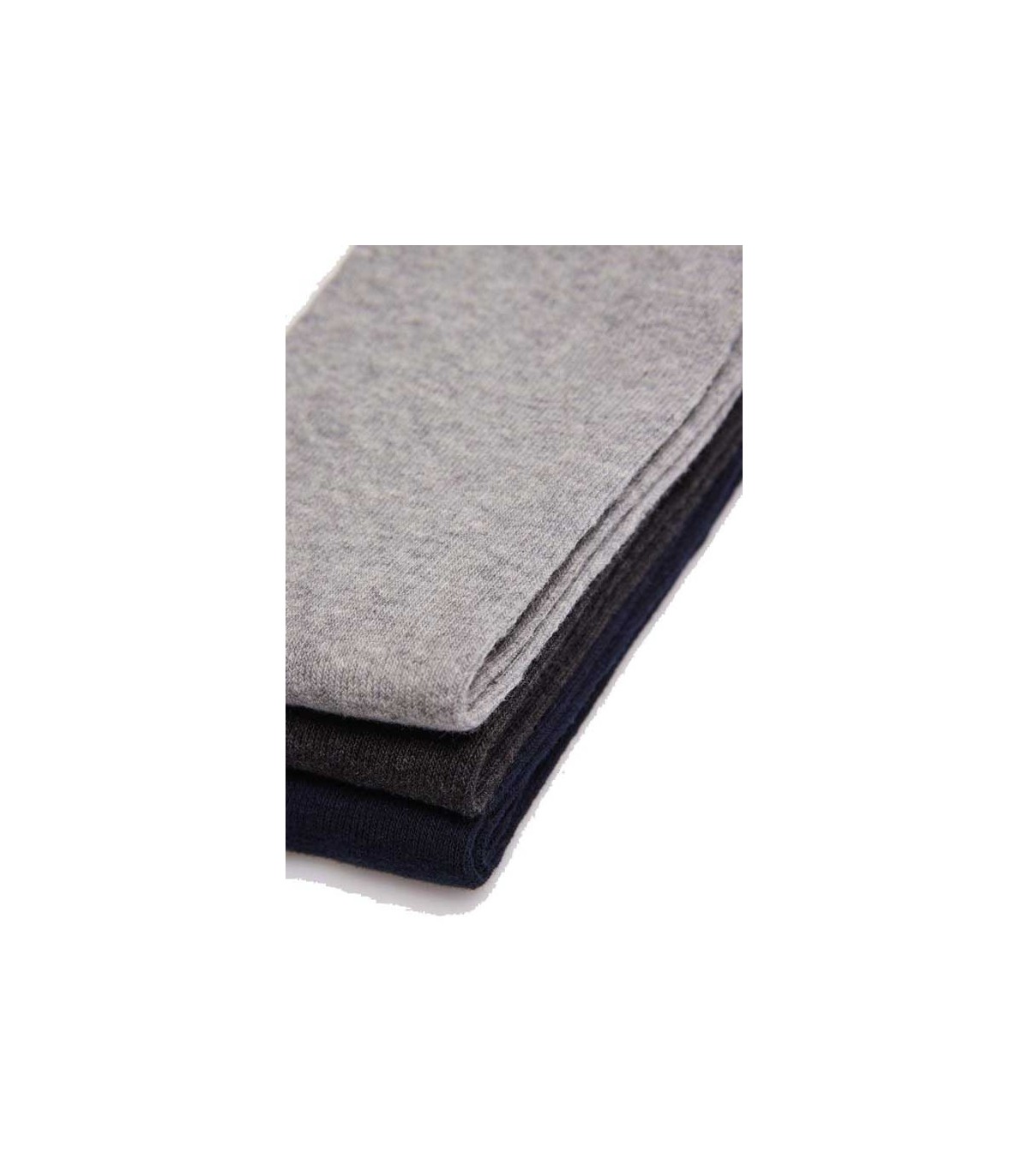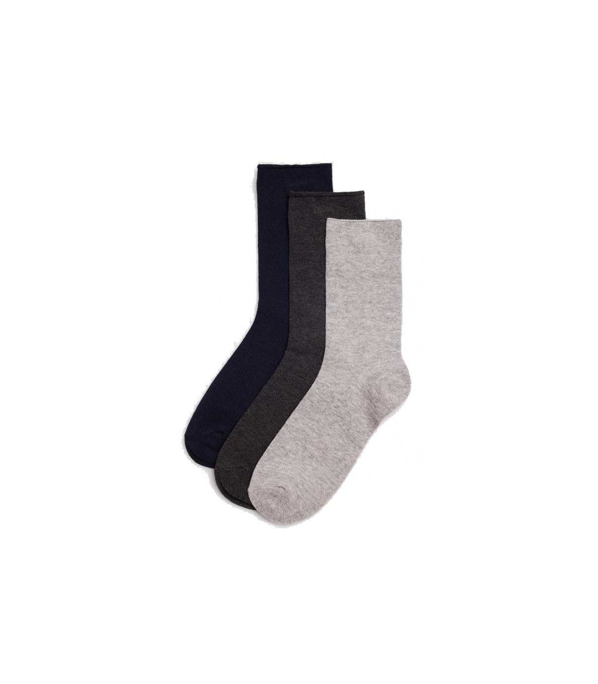 Pack de tres calcetines básicos para mujer sin puño. Incluye tres colores, gris claro, gris marengo y azul marino.