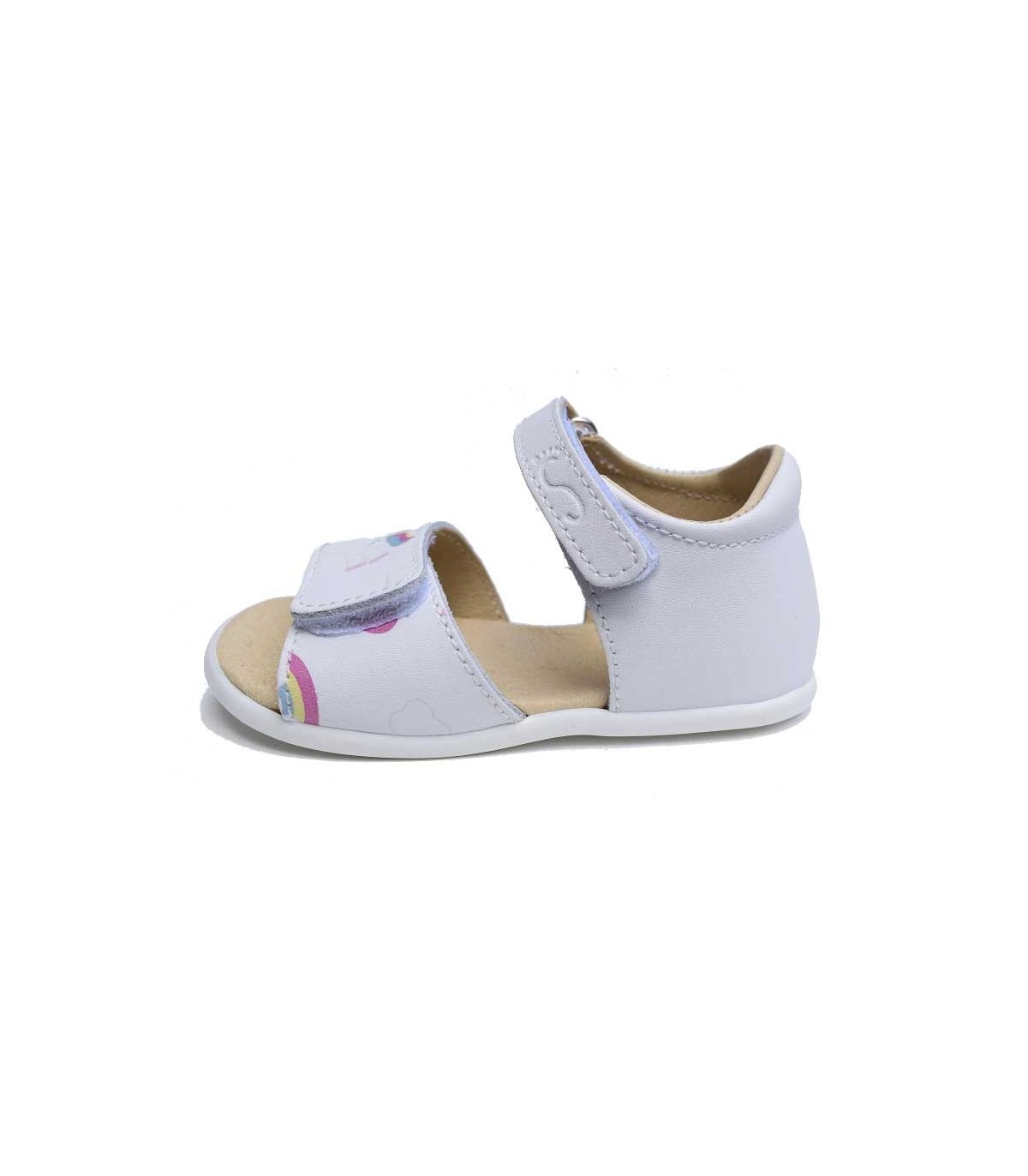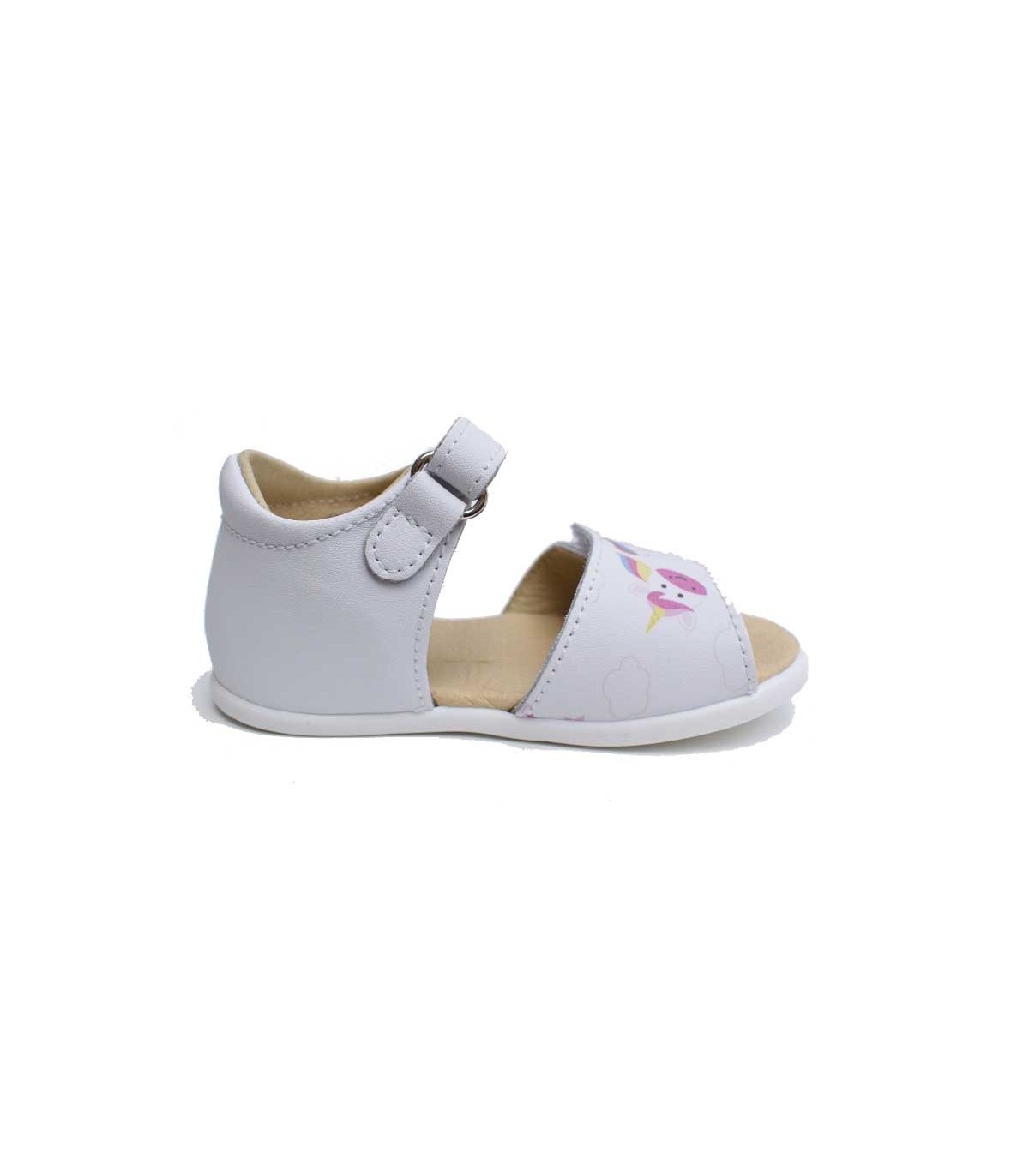 Sandalias infantiles blanditas en piel en color blanco con estampación de unicornios y cierre con dos velcros. Calzado minimalista respetuoso con el crecimiento natural del pie del niño con espacio en la punta para que los dedos se sientan libres. Zapato ideal para uso diario con la puntera reforzada para una correcta protección y libertad de movimiento de los dedos. Suela cero drop.
