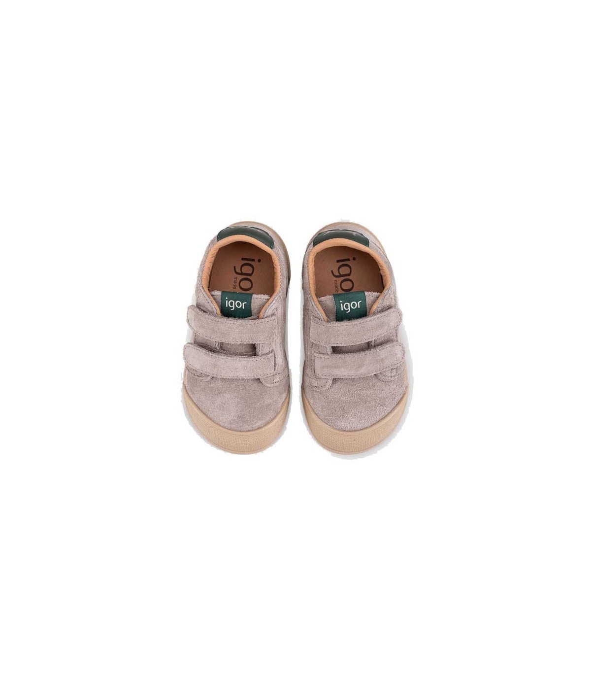 Zapatilla deportiva de piel estilo casual, barefoot, cero drop, flexible y blandito, con plantilla extraíble y cierre con tira adherente para un mejor ajuste. Color topo.