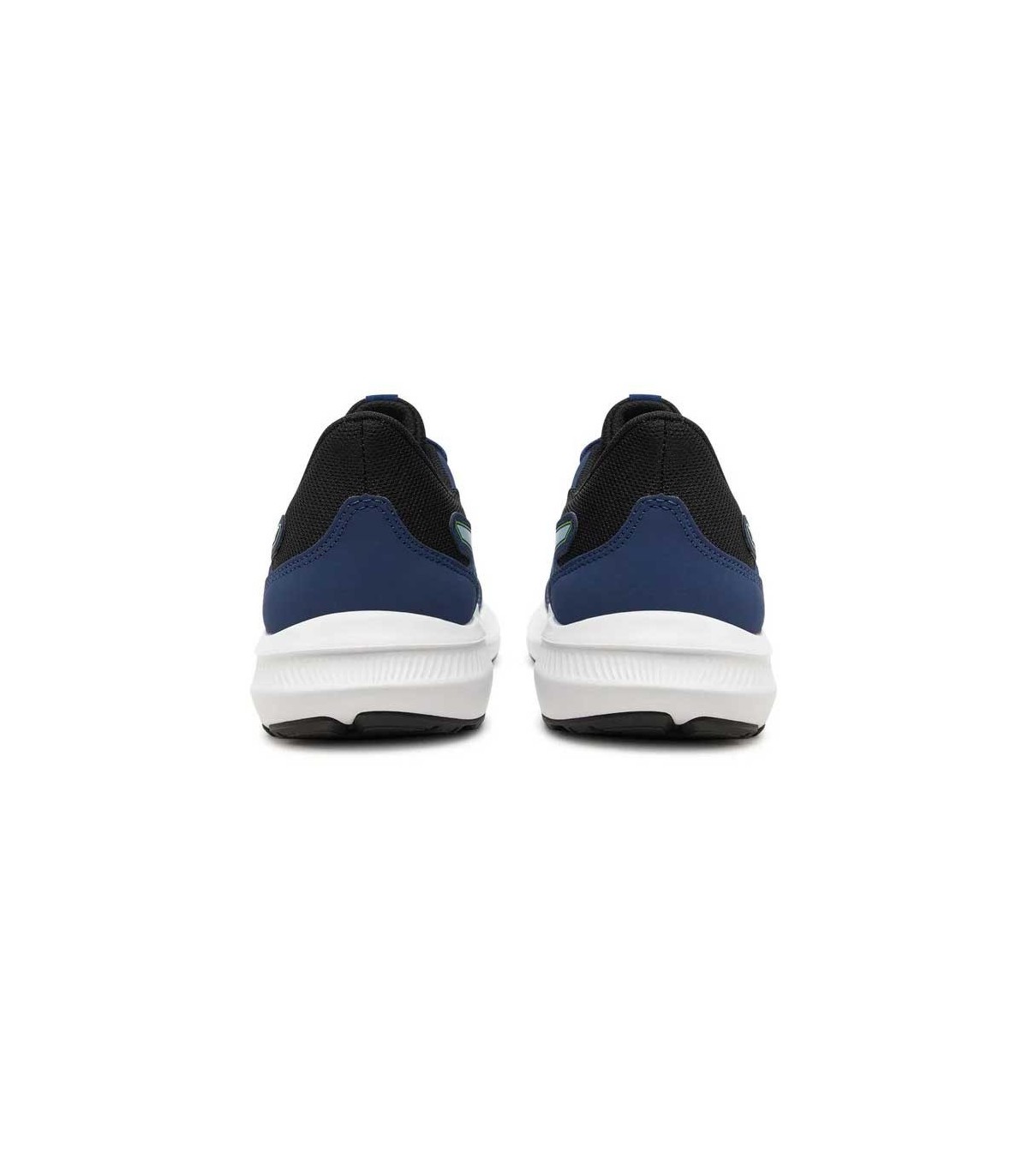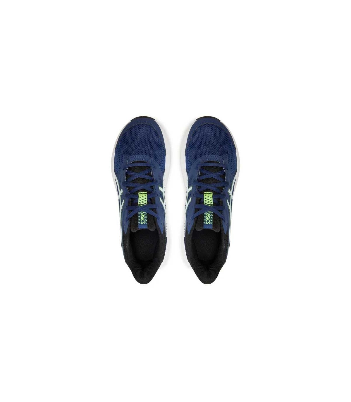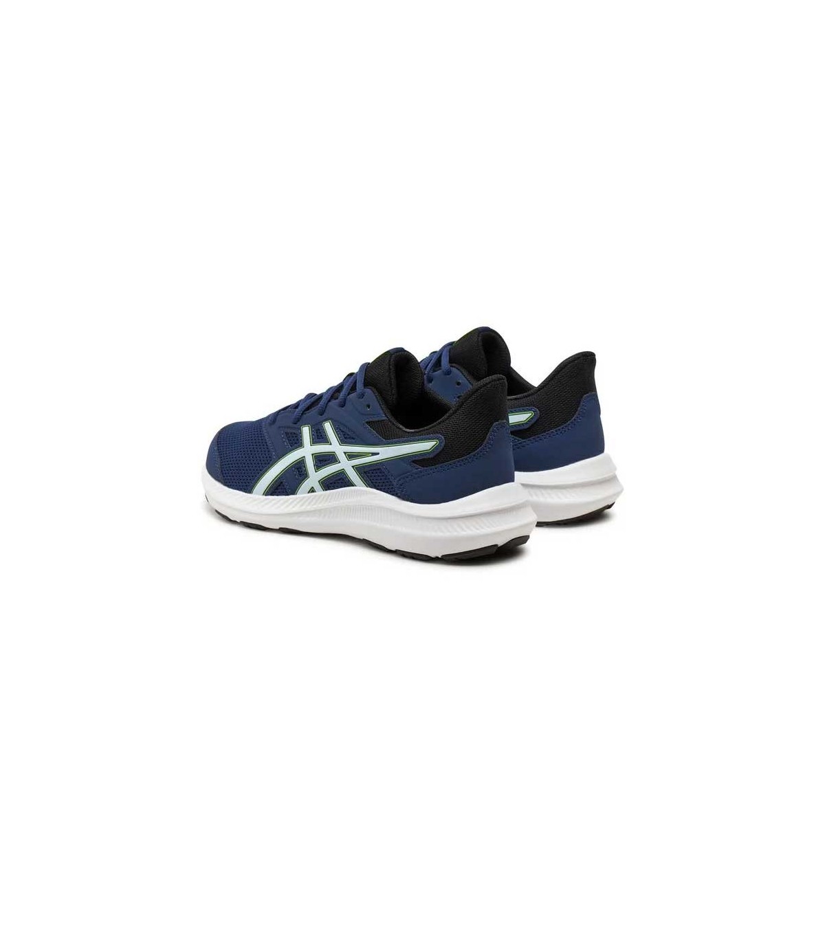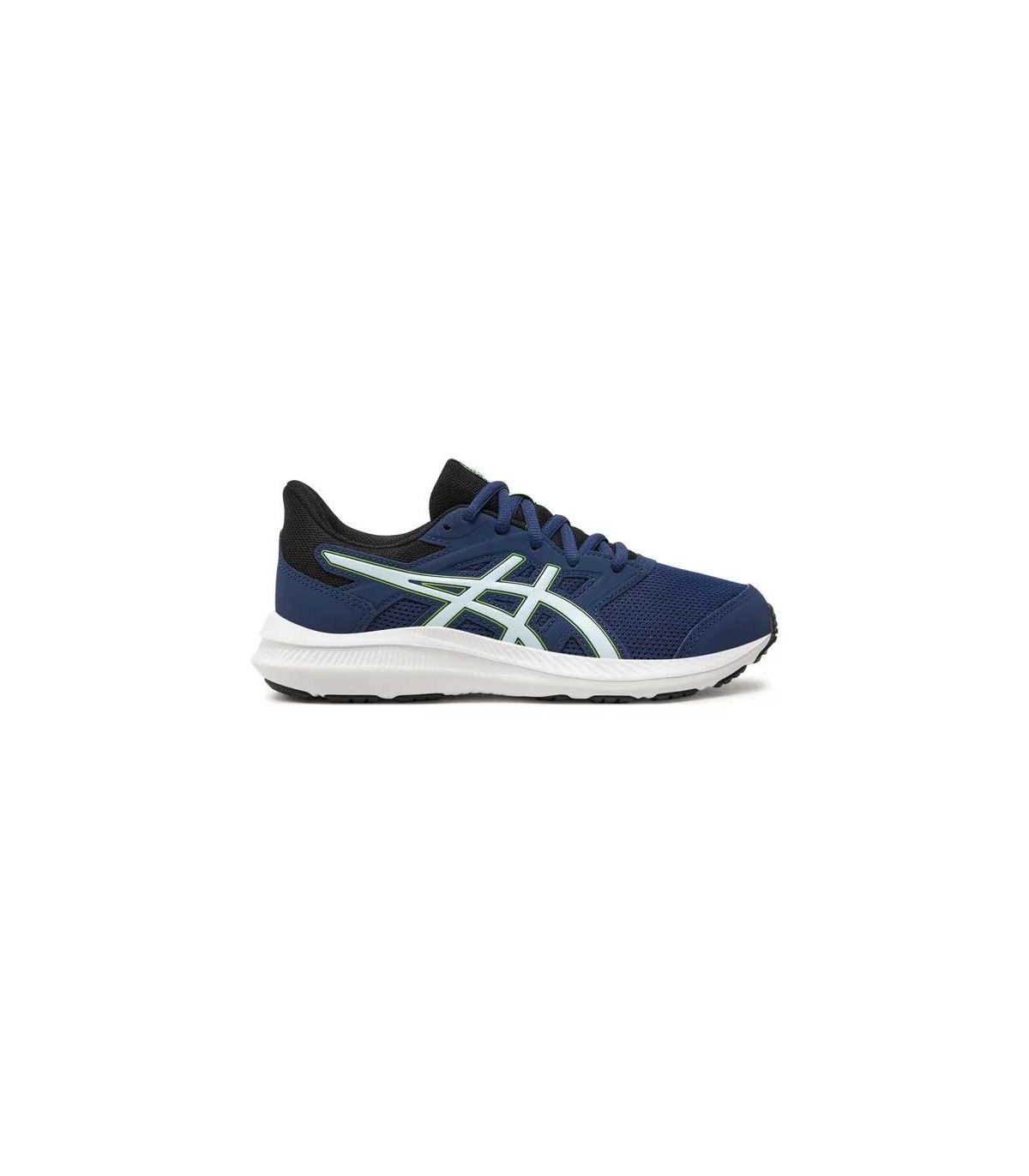 Zapatilla deportiva Asics Jolt 4 Junior color azul/verde, parte superior de malla textil transpirable con refuerzo en la puntera y los ojales, ajuste con cordones. Mediasuela con ligera amortiguación para absorber los impactos y suela de caucho resistente.