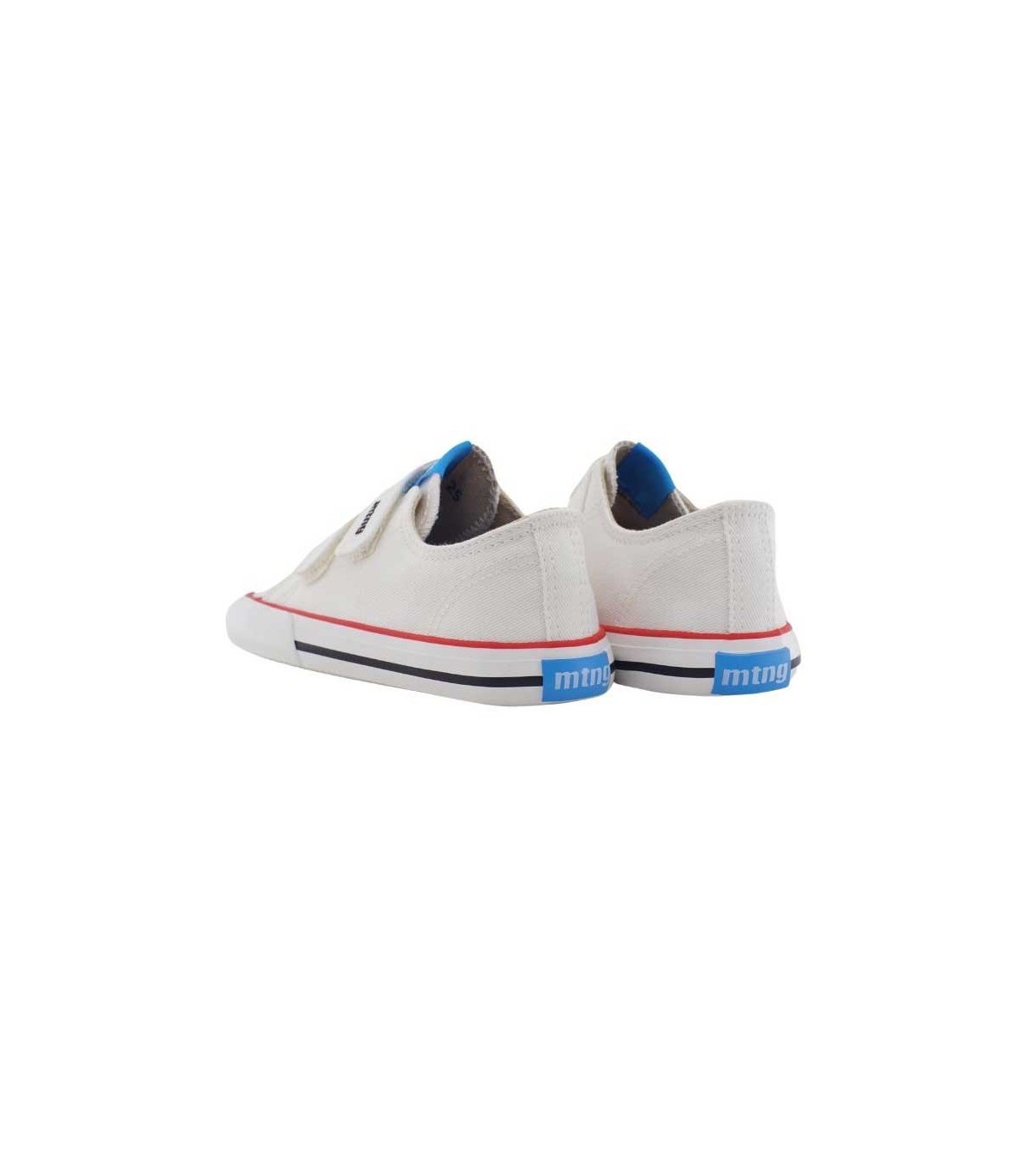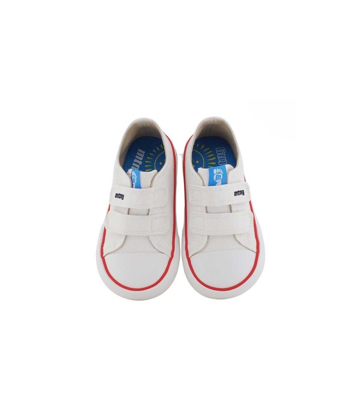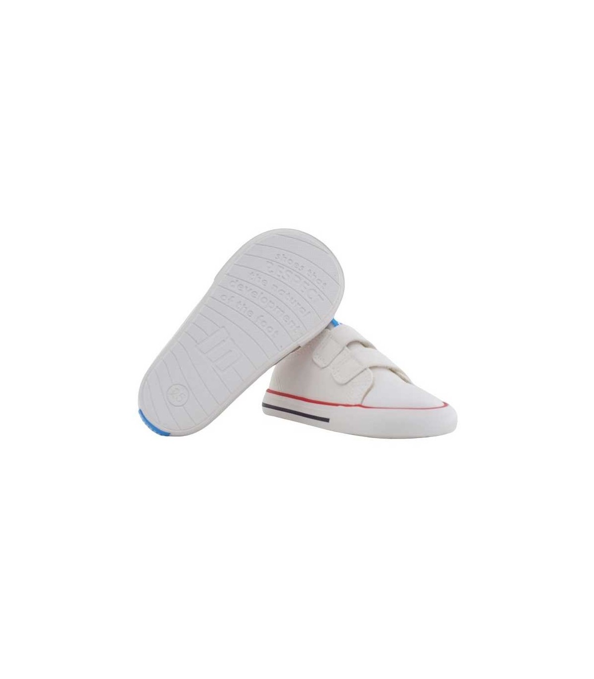 Lona infantil en color blanco con logo de la marca bordado en un velcro. Ajuste con 2 velcros para un ajuste más cómodo. Las lonas Mustang Free están desarrolladas y diseñadas en colaboración con el traumatólogo deportivo Dr. Juanjo López para respetar el desarrollo natural del pie de los niños. Su puntera ancha permite el movimiento libre de los dedos dentro del zapato. La plantilla es extraíble y la suela tiene drop cero. Certificado vegano sellado por INESCOP, el cual garantiza que la naturaleza química principal del material no se corresponde con fibras de origen animal.