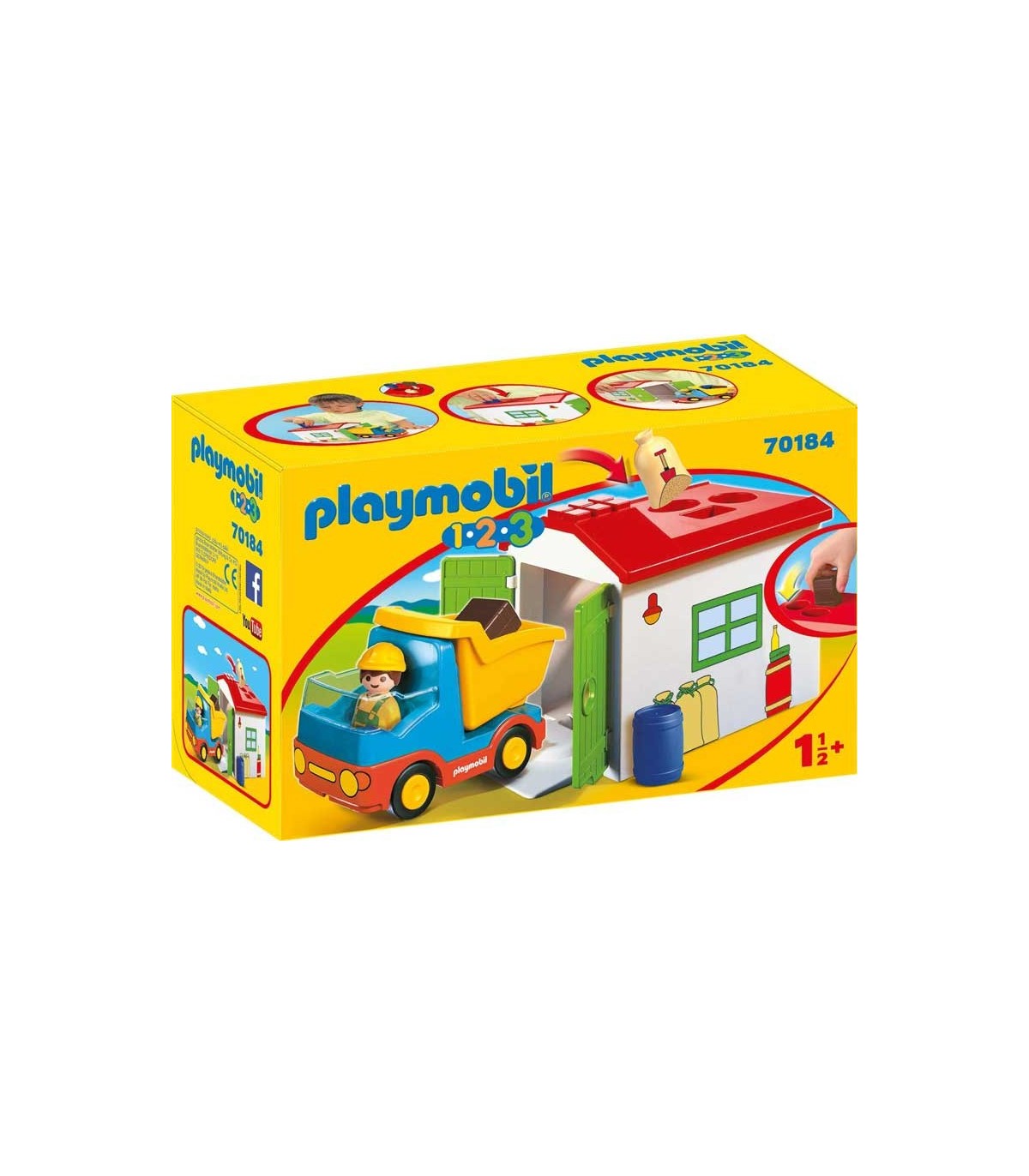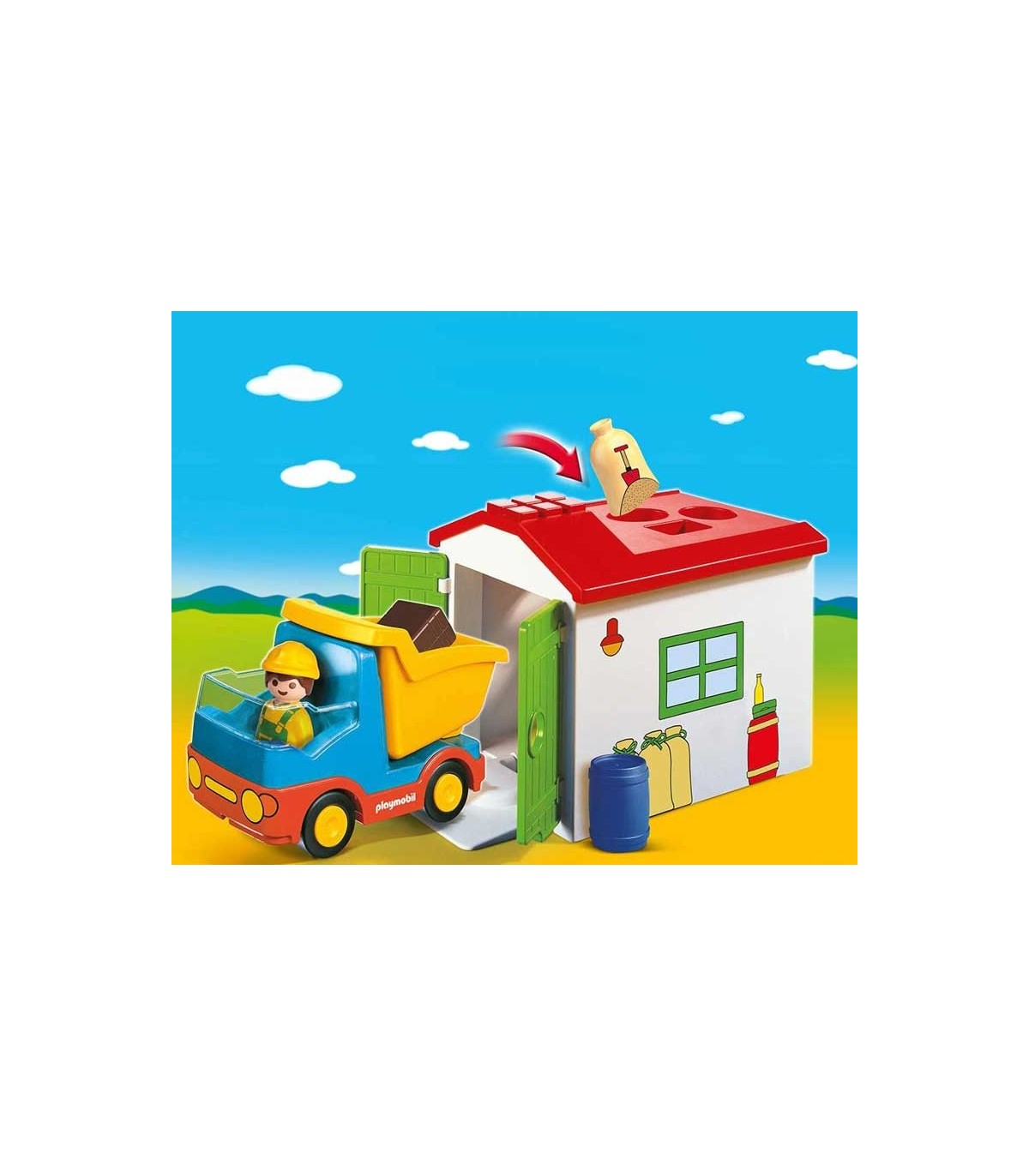 Playmobil 70184 Camión con garaje. Playmobil 1·2·3 con piezas grandes para niños a partir de un año y medio hasta tres años. Los muñecos no se desmontan y no contienen piezas que puedan cortar. Contiene un garaje con una puerta para introducir el camión y varios agujeros