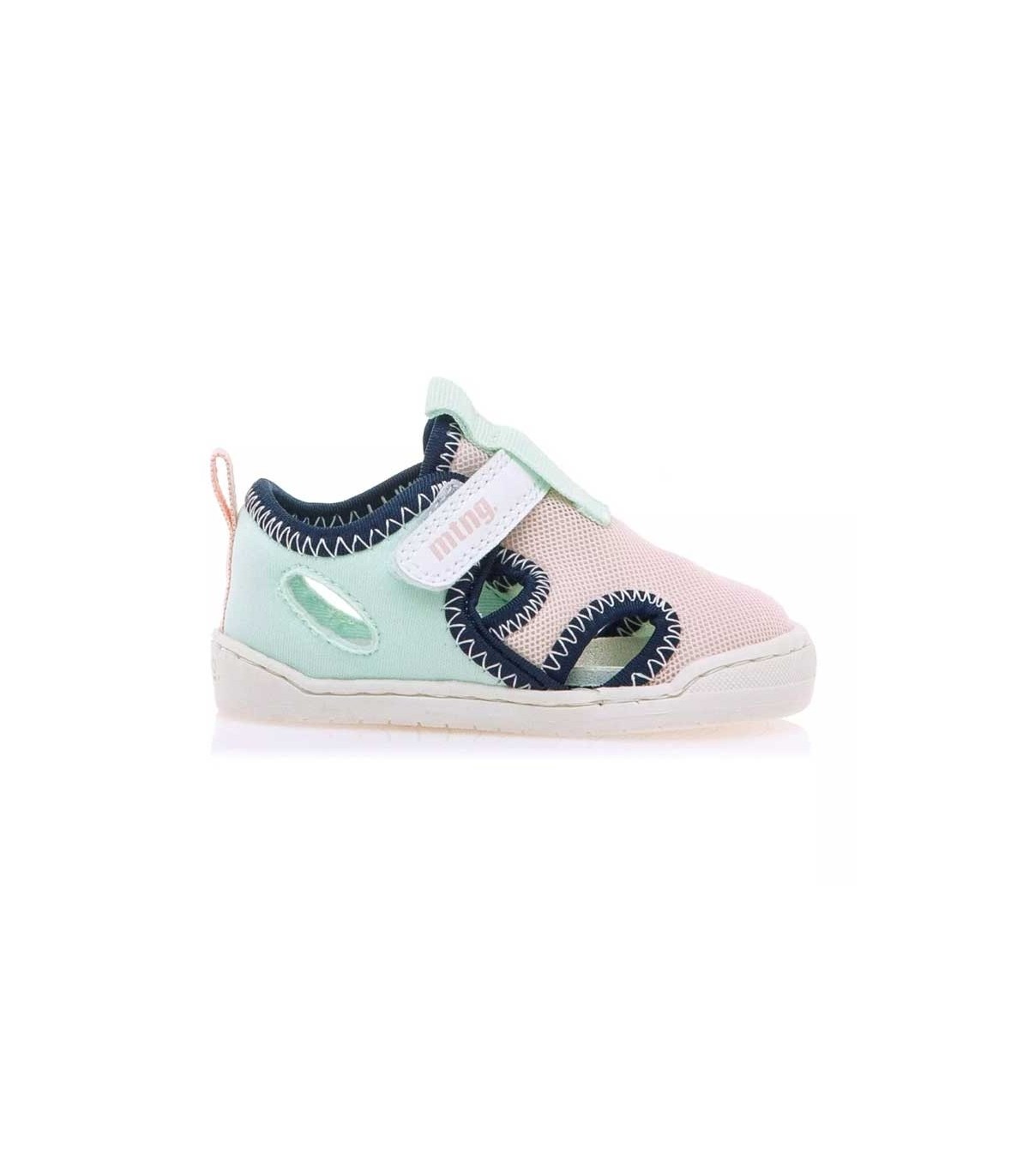 Sandalia cerrada infantil de Mustang en rosa y verde agua. Cierre con 1 velcro para un ajuste más cómodo. Las sandalias Mustang Free están desarrolladas y diseñadas en colaboración con el traumatólogo deportivo Dr. Juanjo López para respetar el desarrollo natural del pie de los niños. Su puntera ancha permite el movimiento libre de los dedos dentro del zapato. La plantilla es extraíble y la suela tiene drop cero. Certificado vegano sellado por INESCOP, el cual garantiza que la naturaleza química principal del material no se corresponde con fibras de origen animal.