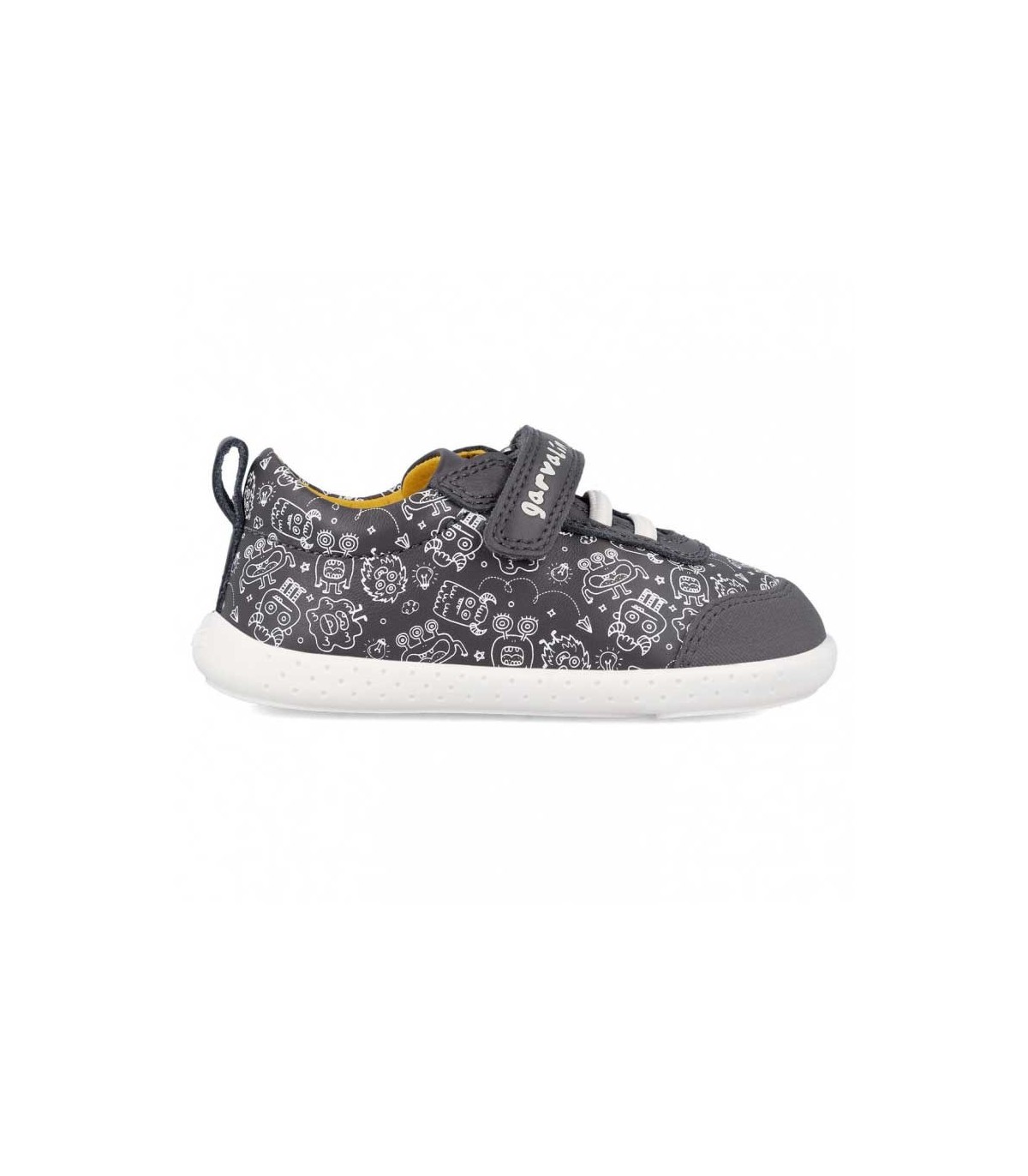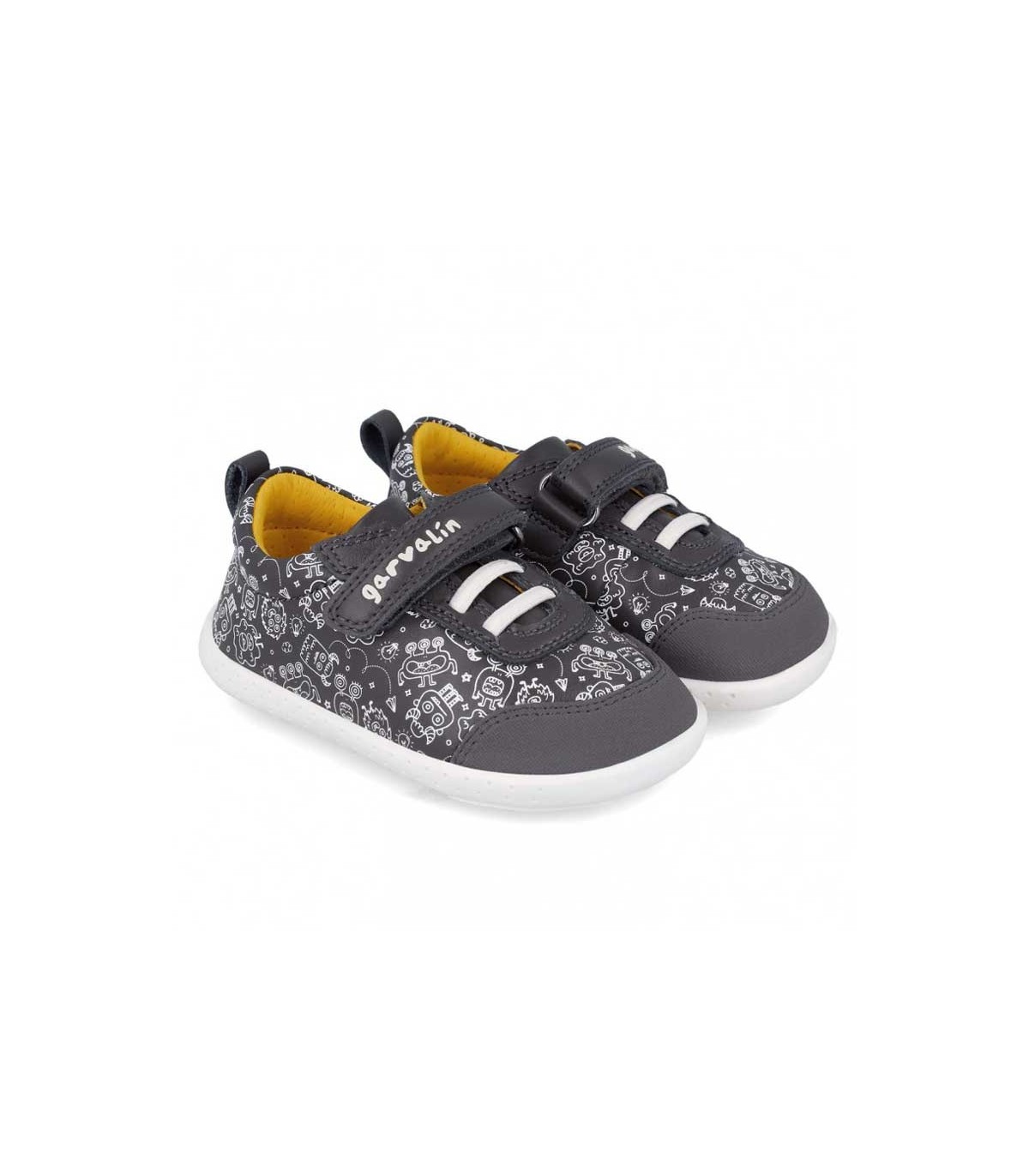 Zapatillas blanditas Garvalín gris antracita con estampado blanco, calzado respetuoso con el desarrollo natural del pie. Drop cero.